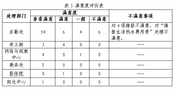 2017年11月,共计有86条信息在办结后被评价,其中80条(包括后勤处64,学工部7,网络中心5,教务处2,影传院及阳光中心各1,)被评价为一般满意及以上,阳光服务满意度达93%。另有6条被评价为不满意,包括后勤维修4条,维智生活热水费用问题2条。具体见下表3。