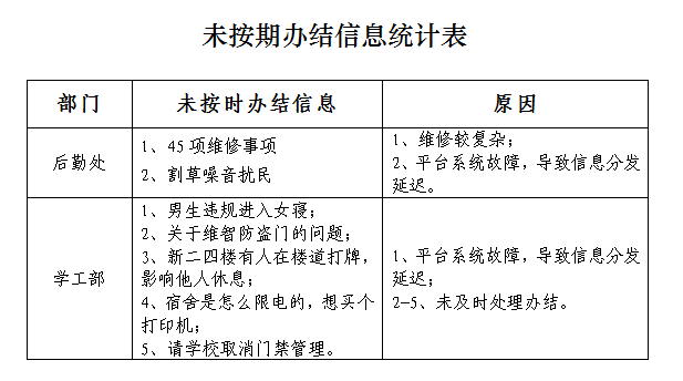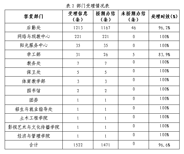 我校教育阳光服务平台2017年11月所受理的各类信息涉及后勤处、网络与现代教育技术中心、学工部、教务处、保卫处及土木工程学院等13个职能部门及院部。其中后勤处受理信息最多,达1213条;其次网络与现教中心221条,学工部31条,教务处7条,经阳光服务中心协调沟通答复的有35条。同时,以在规定时限内办结的信息占所受理信息的百分比衡量处理的时效性,具体数据如表2。具体未按期办结信息见附件。