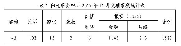 2017年11月,我校教育阳光服务平台共受理信息1522条,其中咨询43条,投诉102条,建议13条,表扬2条,舆情反映6条,报修1356条(含后勤1143,网络213)。截至2017年12月6日,已办结1499条,办结率98.5%。具体数据见下表1。