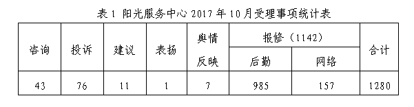 2017年10月,我校教育阳光服务平台共受理信息1280条,其中咨询43条,投诉76条,建议11条,表扬1条,舆情反映7条,报修1142条(含后勤985,网络157)。截至2017年11月3日,已办结1208条,办结率94.4%%。具体数据见下表1。