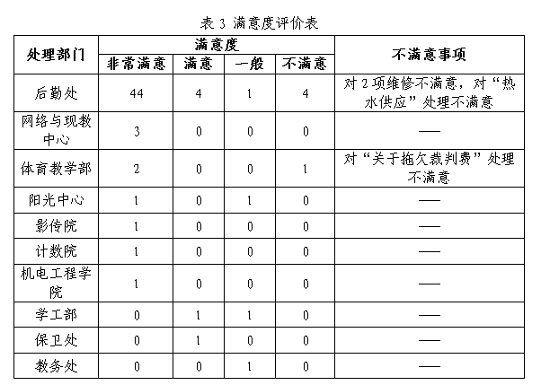 2017年10月,共计有68条信息在办结后被评价,其中63条(包括后勤49,网络3,体育教学部2,阳光中心2,学工部2,影传院、计数院、机电工程学院、保卫处、教务处各1)被评价为一般满意及以上,阳光服务满意度达92.6%。另有5条被评价为不满意,包括后勤维修2条,热水供应2条,体育教学部处理信息1条。具体见下表3。