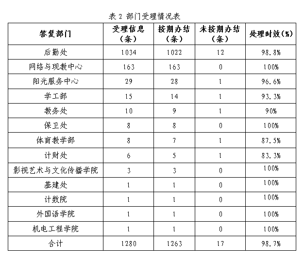 我校教育阳光服务平台2017年10月所受理的各类信息涉及后勤处、网络与现代教育技术中心、学工部、教务处、体育教学部及影视艺术与文化传播学院等13个职能部门及院部。其中后勤处受理信息最多,达1034条;其次网络与现教中心163条,学工部15条,教务处10条,经阳光服务中心协调沟通答复的有29条。同时,以在规定时限内办结的信息占所受理信息的百分比衡量处理的时效性,具体数据如表2。具体未按期办结信息见附件。