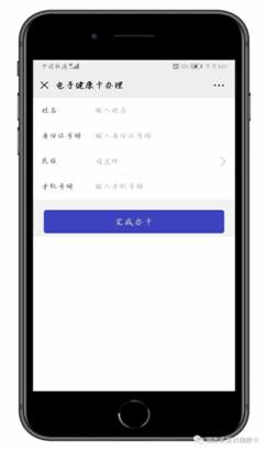 3.点击添加健康卡,按提示输入姓名、身份证号码、民族和手机号码后完成办卡: